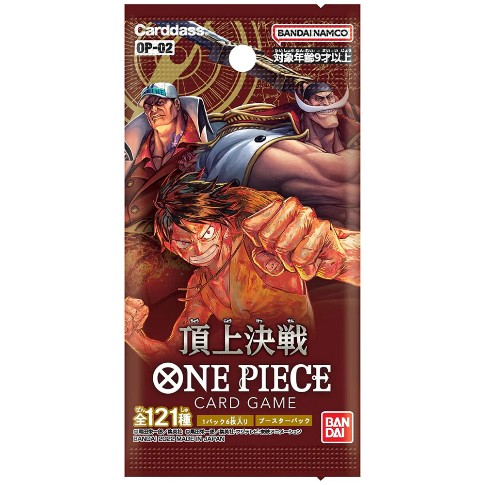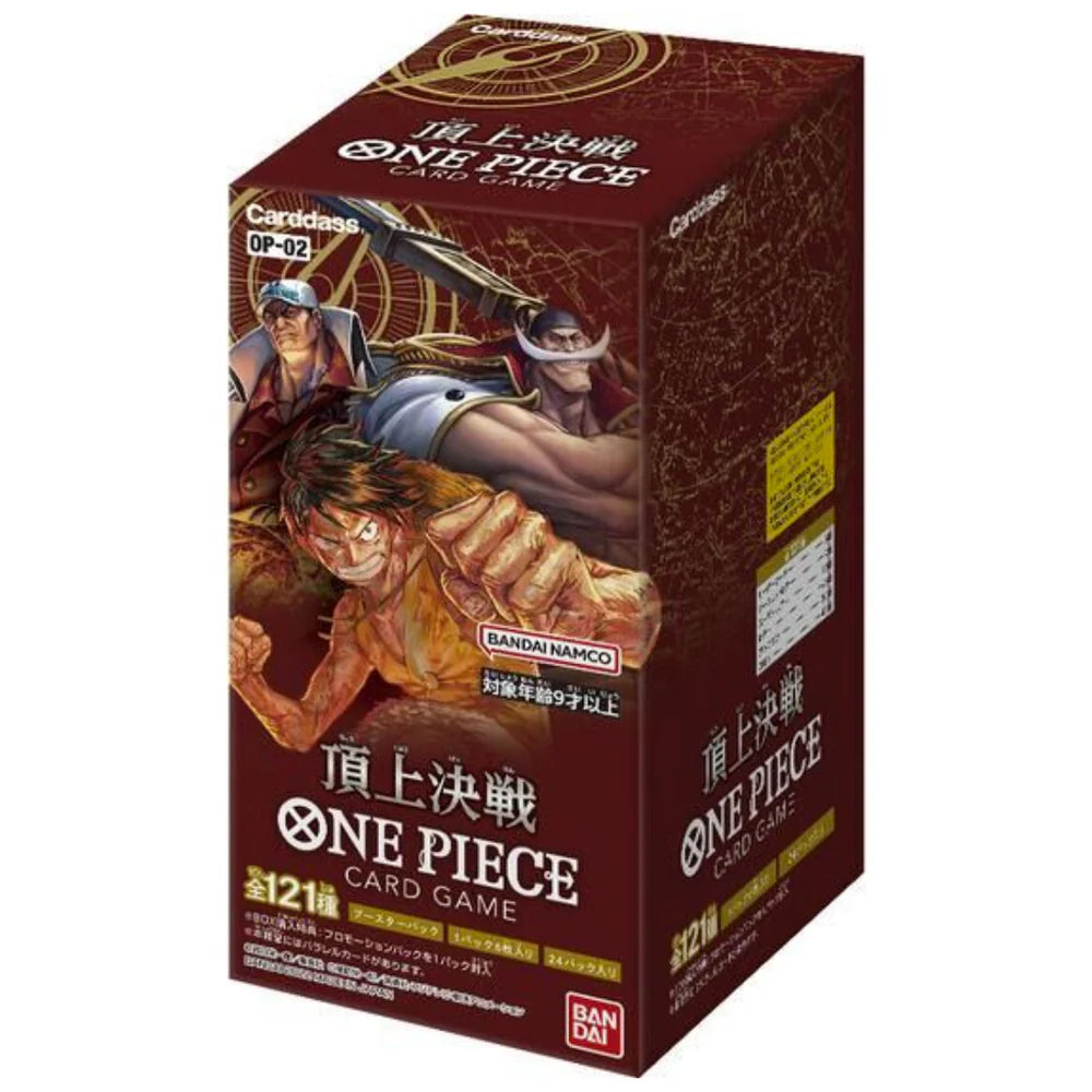 A Japanese booster box from the OP02 "Paramount War" series. Contains 24 booster packs, each with 6 cards.