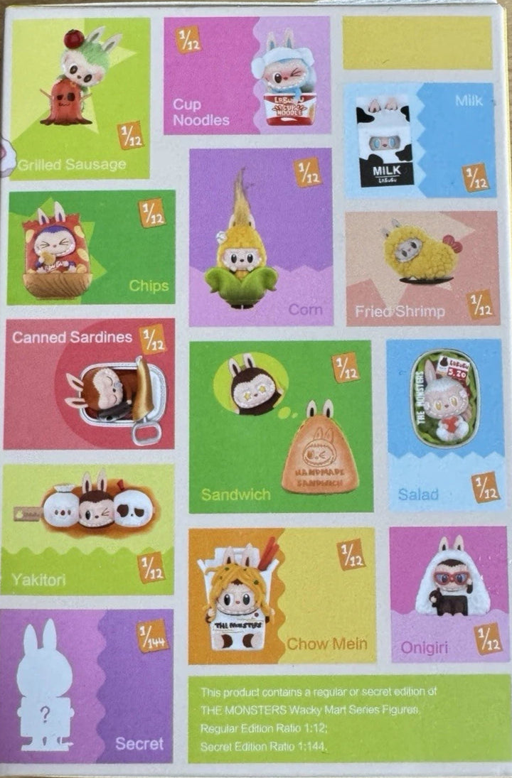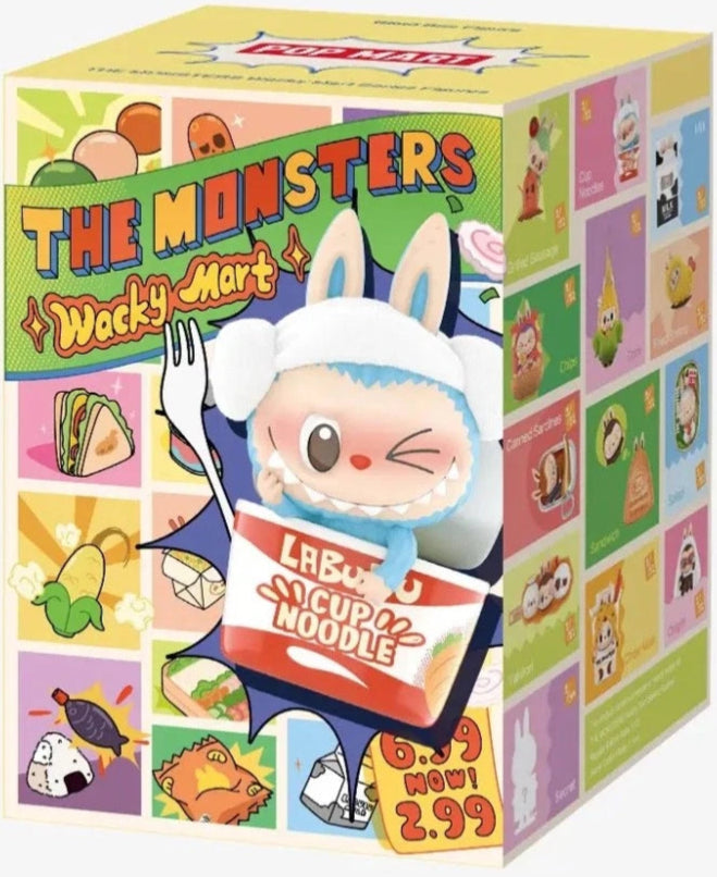 A blind box contains a random Snack Labubu figure from the "Wacky Mart" series: