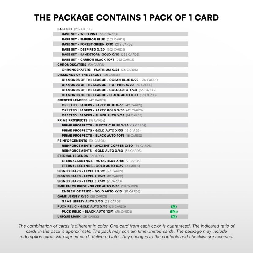 Another option is a card featuring a piece of a puck used in the game and the player's signature (Puck Relic – Gold Auto/15). The rarest variant is the Puck Relic Black Auto 1-of-1.