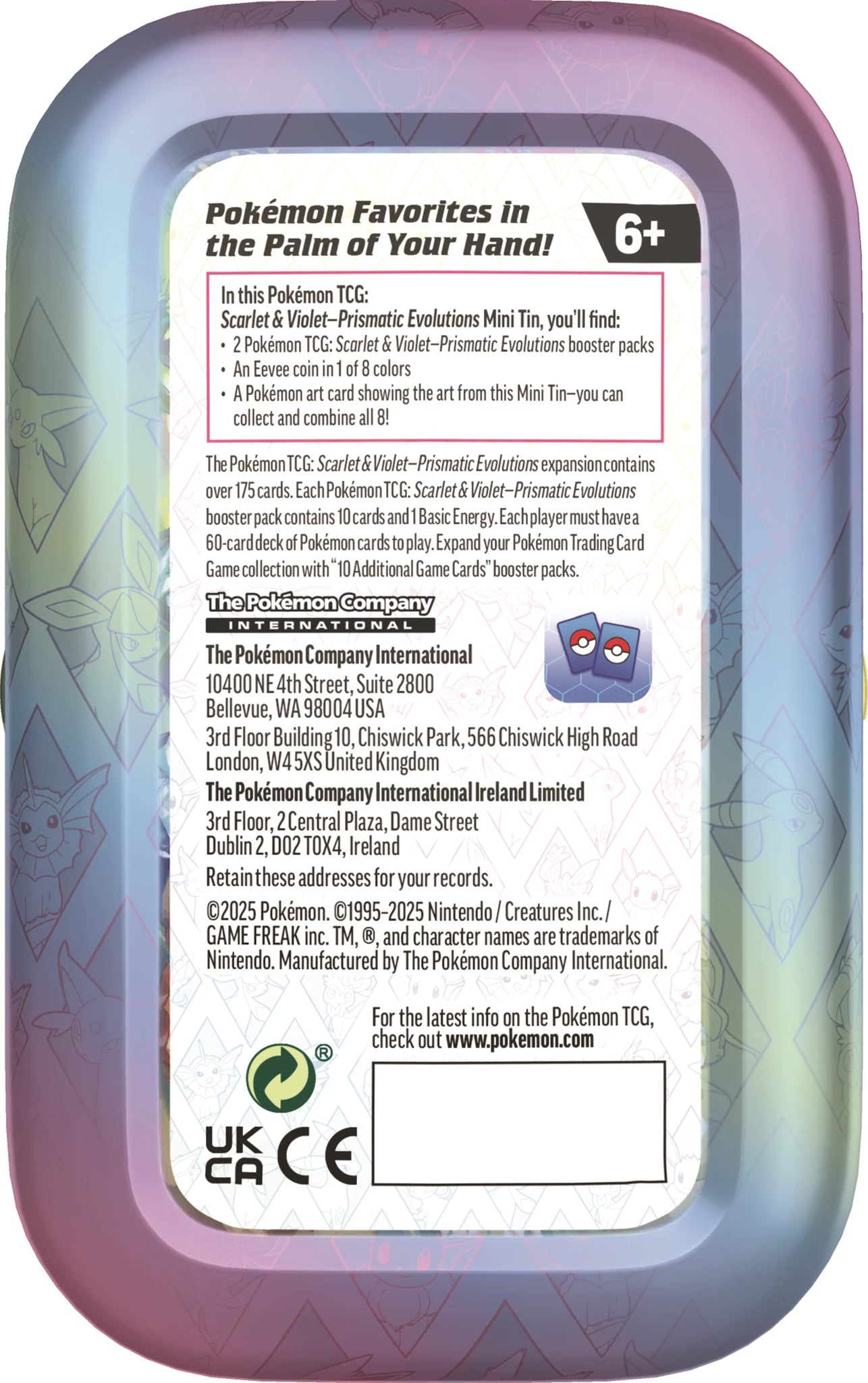 Un présentoir Mini Tin contient 8 Mini Tins. Chaque Tin contient 2 boosters Prismatic Evolutions.
