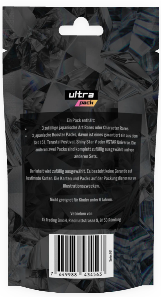 - 3 japanische Booster Packs, davon ist eines garantiert ein aus dem Set 151, Terastal Festival, Shiny Star V oder VSTAR Universe. Die anderen zwei Packs sind komplett zufällig ausgewählt und von anderen Sets.